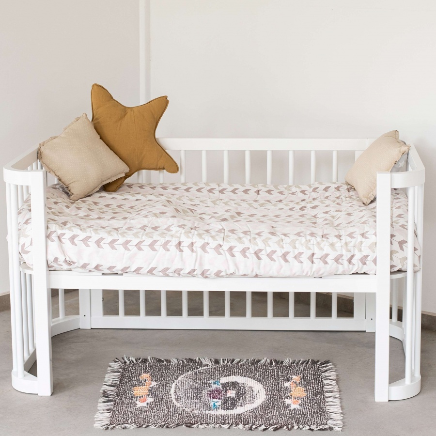 La Cuna Evolutiva de madera maciza acompaña a tu bebé en cada etapa: mini cuna, cuna colecho (con correa incluida), cuna tradicional, cama Montessori y sofá infantil.