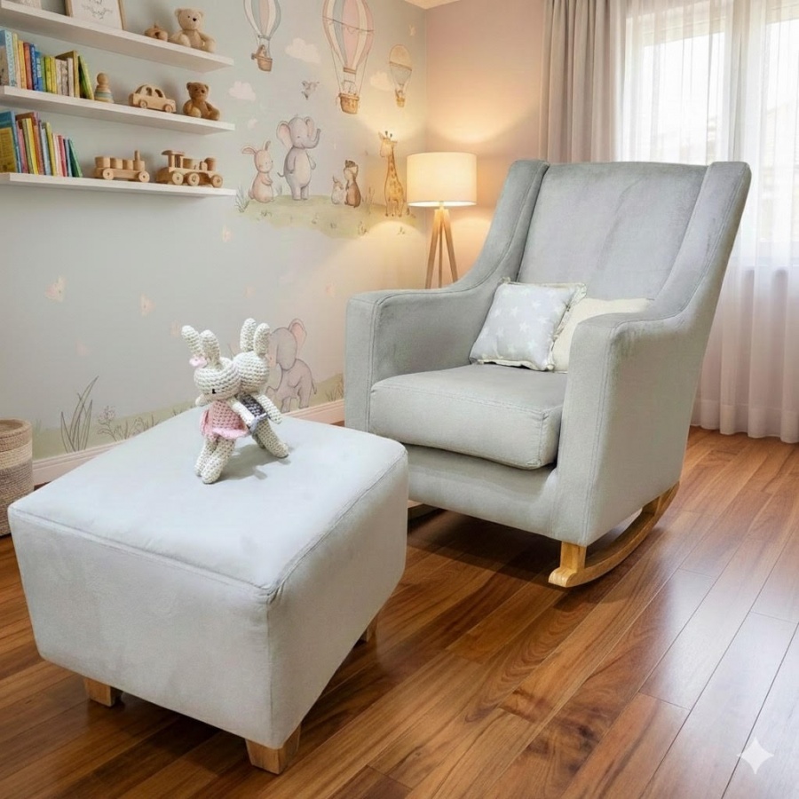 Descuento 35%El sillón mecedor con puff son las piezas perfectas para crear un ambiente tranquilo y relajante en la habitación de tu bebé.